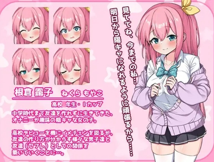 色情场景既简单又充满魅力的要素,是最棒的!游戏部分,也能享受为了发生情境而探索的要素!不仅有拜访场所,还有全裸穿球鞋、收集硬币等!是非常能享受魅力的游戏作品!根仓霭子为了告别中学时代阴郁的自己一个人在自己的房间里一边咕嘟咕嘟地练习自我介绍,一边为高中出道做准备。……然而,准备周全的根仓霭子的脑海中,却没有想到最重要的交朋友这件事…!不知道为什么,她和一个不露声色的男生成为了朋友。他误以为做了H的事就会增加朋友,于是实施了一个可以被称为奇异行为的作战计划…